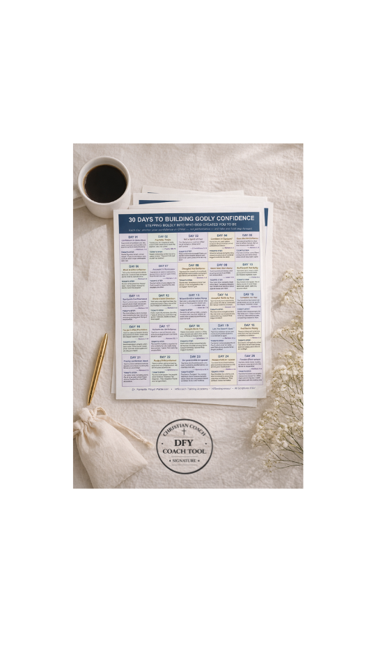 A done-for-you 30-day confidence challenge for Christian coaches and counselors to use with clients battling self-doubt and shrinking back. Scripture-based daily themes and bold action steps. PDF and editable Google Doc.