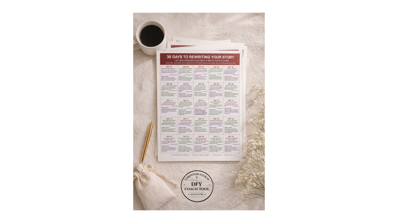The 30-Day Rewriting Your Story Challenge is a done-for-you, faith-based narrative healing tool designed for Christian coaches, counselors, and ministry leaders. This structured 30-day challenge walks your clients through the process of: ● Releasing limiting and painful narratives ● Renewing their thinking through Scripture ● Rebuilding their identity through God’s truth Each day combines Scripture, a focused theme, and a simple action step to help clients move from identifying with their pain to walking in their purpose. It is designed to create steady, meaningful progress between sessions without requiring you to create additional content.