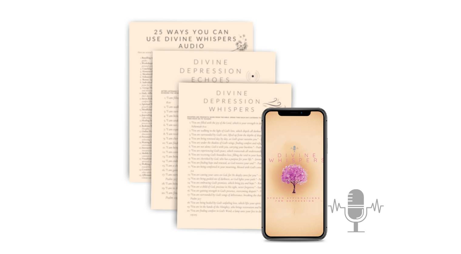 Embrace the transformative power of “Divine Depression (Prophetic) Affirmation: Whispers and Echoes – PLR Audio MP3,” a rebrandable (PLR) audio series thoughtfully curated for spiritual leaders, therapists, coaches, and mentors navigating the delicate realm of depression. This comprehensive collection features 20 pairs of divine affirmations, intricately woven as Whispers (prophetic words) and Echoes (personal affirmations), in a professionally recorded, dual-gender track format. Whispers (You Statements): Each Whisper, anchored in biblical wisdom, acts as a guiding light through the shadows of depression. These statements lay the groundwork for a profound acceptance of divine truths, fostering spiritual and emotional well-being. Echoes (I Am Statements): The Echoes empower listeners to personalize and internalize these truths in the first person. By vocalizing affirmations, a personal connection with the divine is forged, reinforcing faith and asserting a claim on emotional healing.