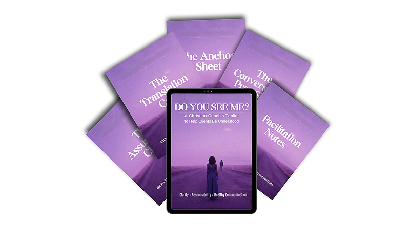 The Do You See Me™ Toolkit provides a complete system of Christian communication resources: 1. The Anchor Sheet: A reflection tool to define personal needs for understanding. 2. The Translation Card: A framework for converting “You” statements into invitational language. 3. The Assumption Check: A relational reset tool to identify and express unspoken expectations. 4. The Conversation Prep Sheet: A practical guide for regulating emotions before a difficult talk. 5. The Do You See Me™ Infographic: A visual map of the full process from frustration to clarity, designed to help clients see the communication cycle at a glance. 6. Facilitation Notes: Detailed prompts, session structures, and implementation support for leaders.