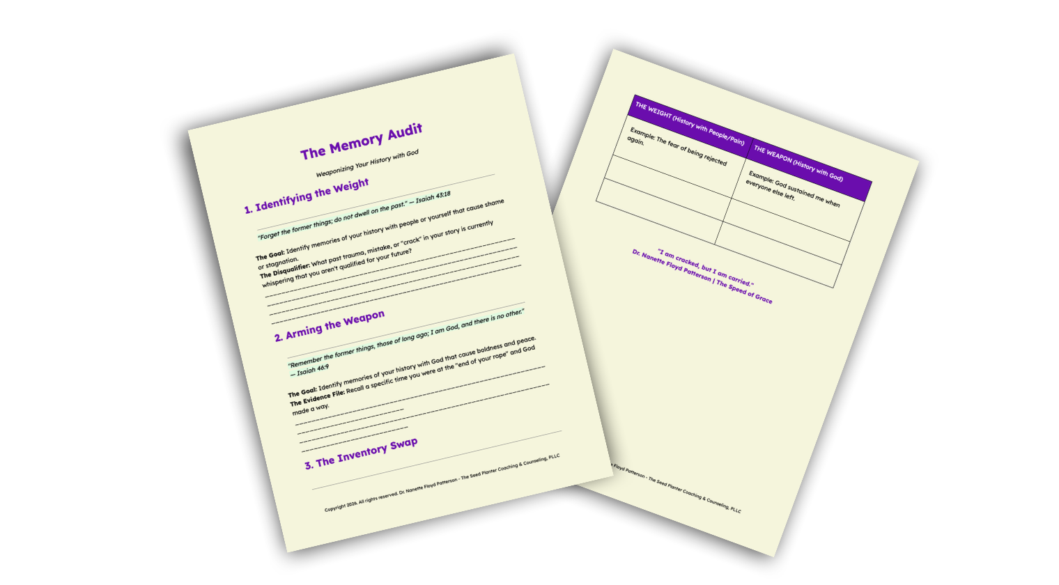 The Memory Audit™ is a guided worksheet that helps you: Identify hidden emotional blocks Reframe painful memories through truth Build confidence from your history with God In just a few steps, you’ll move from shame and stagnation to clarity, peace, and boldness. “I am cracked, but I am carried.” Stop letting your past define you. Start using it to propel you forward.